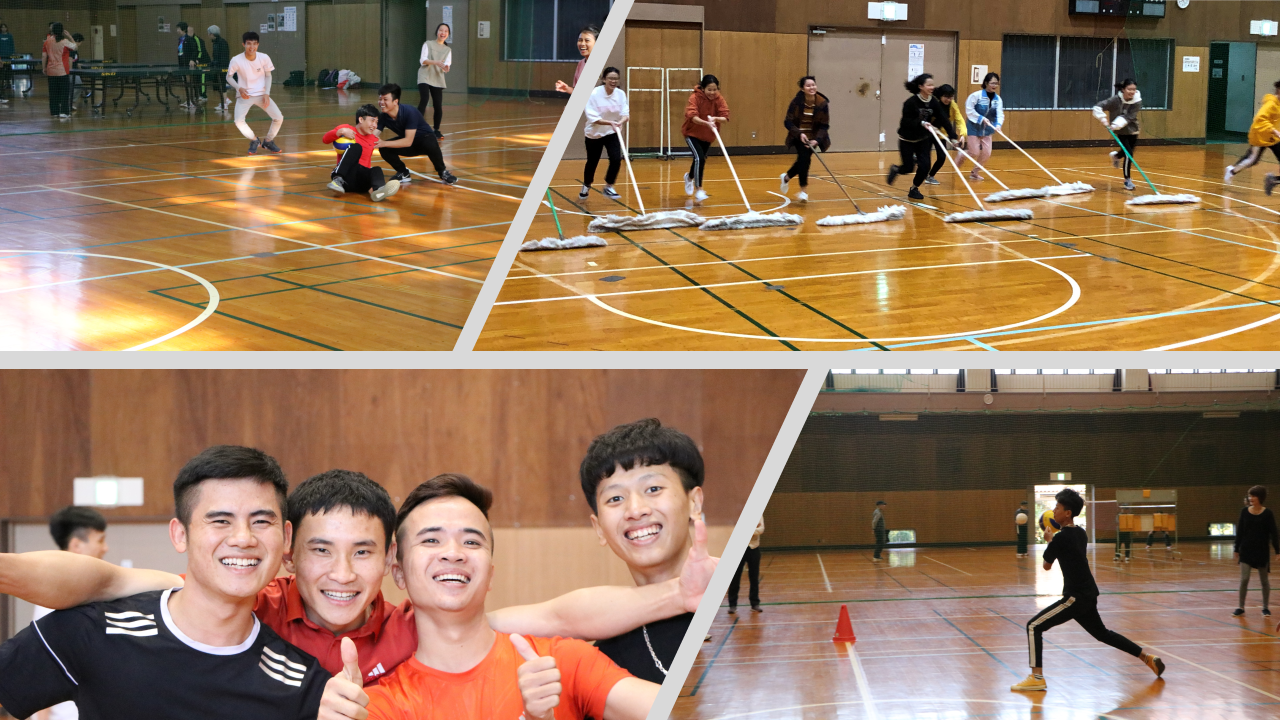 慣れ親しんだサッカーやバレーボールではなく、今回はドッジボールを行いました。ベトナムのルールでは外野がないようですが、日本のドッジボールを知らない実習生がほとんどでしたので、まずはルールの説明を行いました。楽しんでリフレッシュする前に、ケガ防止のため、入念にランニングとストレッチの準備運動を行いました。その後にクラス対抗で勝負をしました (^^)/