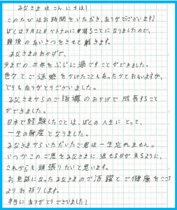 MARUでは3年間の技能実習を満了したものの新型コロナウイルスの影響により帰国困難となってしまった実習生の受入れを行いました。MARUの施設にて約2ヶ月待機生活となりましたが、政府チャーター便にて帰国することとなりました。帰国前にお礼の手紙を書いてくれましたのでご紹介いたします。彼は3年前にMARUにて入国後講習を受けましたが、その時と同じように周りの人を和ませるはにかんだ笑顔が印象的でした。スタッフに何度も何度も『ありがとう』と言ってくれました。大きな怪我や病気、トラブルなどがなく無事に帰国することができたようで、ほっとしています。母国での活躍を心より願っています!(^^)!