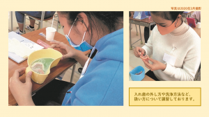 『口腔ケア』とは、口の中を清潔に保つことで、口腔内だけでなく体全体の健康を保つケアのことです。 体の機能が衰えると、自力で口腔環境を整えることが難しくなるため、介助者が代わりに利用者の口腔内に気を使ってあげる必要が出てきます。口腔機能が低下すると、「噛んで味わう」「飲み込む」といった動作をスムーズに行えなくなるため、十分な栄養を摂取できません。栄養不足状態が続くと、運動機能の低下や認知症の進行、さらなる摂食障害につながる可能性があります。口腔ケアは、歯磨きや口腔内の洗浄で歯周病などを予防するだけでなく、摂食トレーニングや誤嚥性肺炎の予防といった高齢者の身体機能の回復にもつながります。 口腔ケアの効果やポイント、利用者のストレスを小さく抑えるために、正しい方法を学び適切に行えるように講習をしております。