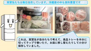 野菜や果実を買った状態(袋ごとやむきだしのまま)で冷凍室に入れることもありますし、飲み物が入ったステンレスボトルを入れていることもありました。入れる場所がおかしい時には指摘し、何をどのような状態でどこに入れるべきなのかを実習生に考えてもらいます。