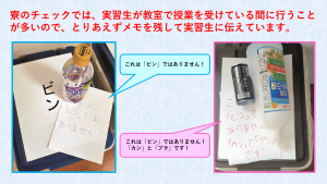 入寮時にごみの分別やごみを出す日、場所、出し方などを説明します。寮には分別の詳細を書いたものやごみカレンダーを掲示し、ごみ箱も種類ごとに設けています。その後も、寮チェックの際にごみ箱を確認し、間違えて入れられているごみは取り出し、どこに入れるべきかを指導します。また時間をとってごみの分別の授業も行い、なぜごみを分別するのかを一緒に考え、あらためてごみの種類や識別表示マーク、捨てる際の注意点などを丁寧に説明します。