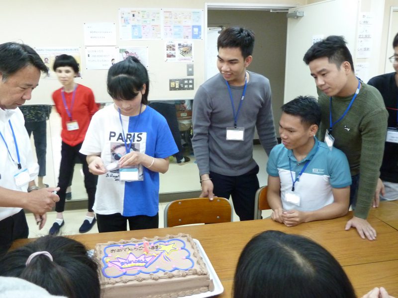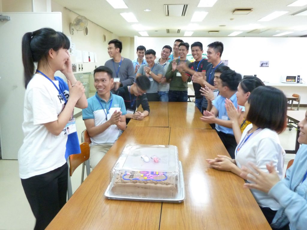 MARUでの実習期間中に20歳の誕生日を迎えた実習生をこのたび全員でサプライズの祝福をしました。幸運を射止めたのはベトナムからの女性でした。日本では大人の仲間入りをするという意味づけをお祝いの言葉とともに説明しました。ベトナムのケーキは背の高い円筒型のようですが、お祝いの言葉が書かれた大きなテーブル状のケーキが贈られ、非常に感激していました。出席したみんなもお腹がいっぱいになりました。