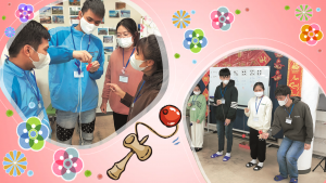 けん玉大会、こま回し大会も開催しました。けん玉は教室に常備しているので休憩時に練習した人もいて、けん玉はほとんどの実習生がすぐに上達しました。しかし、こまは…まず紐を巻くのに苦戦し、やっと紐が巻けてもいざ投げてみると紐を引くタイミングが難しいようで、こまが後ろに飛んだり横に飛んだりなかなか上手く回せませんでした。でも皆、こまを回したくて諦めずに何度もチャレンジしていました😤