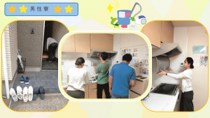 まず男性寮では玄関前に靴を出し、ドアも開けて必死に掃除していました。2人だけだったので大変だったようです😖スタッフから換気扇に油汚れが残っていることを指摘され、実習生はすぐさま拭き取っていました💦
