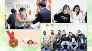 ベトナム、中国の実習生が多数いましたので旧正月を祝うイベントを行いました。まずは皆で「新年あけましておめでとうございます!」の挨拶とともにクラッカーを鳴らしてイベント開始です。外部講師を招いて、歌&踊りと、干支の話をしていただきました。歌&踊りは、歌にのせて「右手」と言われれば右手を動かします。右手を動かしながら次に左手と言われれば左手も動かして、右足、左足・・・と動かす部位が一つずつ増えていき、最後には目玉まで動かす事になり皆笑いがとまりません。干支の話は「十二支のはじまり」についてです。皆真剣に聞いていました。
