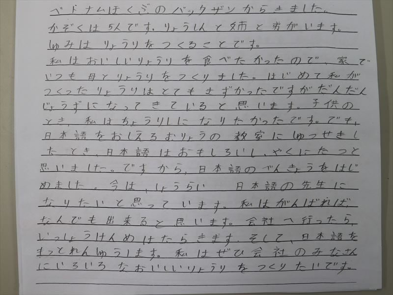 実習生は母国で実習先企業様との面接後、数ヶ月の研修を受けてから入国します。対面式を実施することにより、企業様からはその後の実習生の成長ぶりを再認識することができ、また実習生にとっては企業様と面談することで、実習への意識の高揚と不安払拭することができます。その対面式では実習生が自己アピールする目的で自己紹介の発表をします。その台本として作文を作るのですが、各個人が特色を出せるように趣味からの展開、家族からの展開、将来展望からの展開を織り込み、スタッフから個人指導を受けながら一生懸命取り組んでいます。