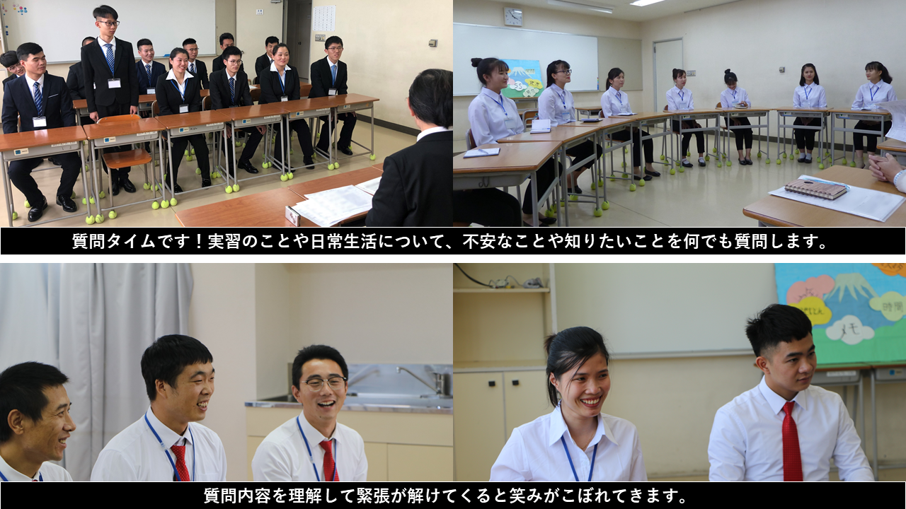 企業様との対面式の様子 入国した実習生に約半年ぶりに再会し成長した姿を確認して、配属前に実習生の不安を払拭するために対面式を行っています。 企業様は逞しく成長した姿に驚かれ、1人1人に対し励ましとお褒めの言葉をいただいております。