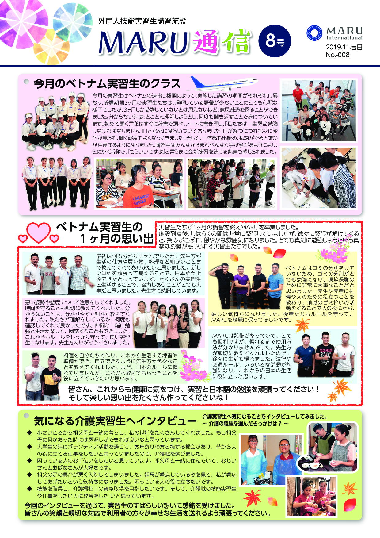 外国人技能実習生の入国後講習の近況を記した『MARU通信8号(11月号)』を発行いたしました。 今月はMARU通信6号(9月号)でご紹介しました介護職種で来日し、当施設で講習したベトナム実習生たちが介護の職種を選んだ経緯について掲載しております。それぞれが育っていく環境の中で祖父母やお年寄りから暖かく面倒を見てもらったことを恩返ししたいとの熱意で発起しています。現在では日本の介護施設で習熟しながらのOJTで施設利用者に持ち前の明るさで元気に働いている様子をお伝えいたしました。