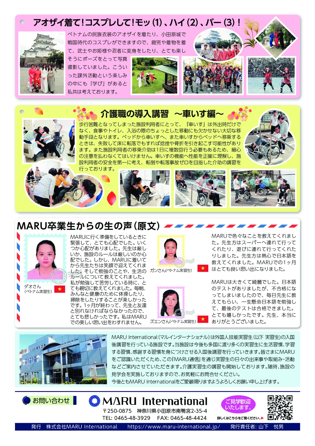 MARUは外国人技能実習生の入国後講習施設として活動していますので、既に数多くの実習生が多方面に渡る産業分野で実習しております。当施設での滞在期間は約一ヶ月で、ごく短いのですが、来日直後であるため体験や学習した様々なことについて実習生は深い印象を持っています。そのため実習生が手紙を送ってくれ、それぞれの近況を報告してくれます。その一部をMARU通信に掲載してご紹介しています。わたしたちはそれぞれ実習生の特別な思い出を頭に描きながら有り難く読ませてもらっています。実習先で心配なく、無事に実習や生活できるように日々サポートしています。 また、この『MARU通信』を通じ実習生の日々の出来事や取組み・活動などご案内させていただきます。介護実習生の講習を行っておりますので、施設の見学などお気軽にお問合せください。