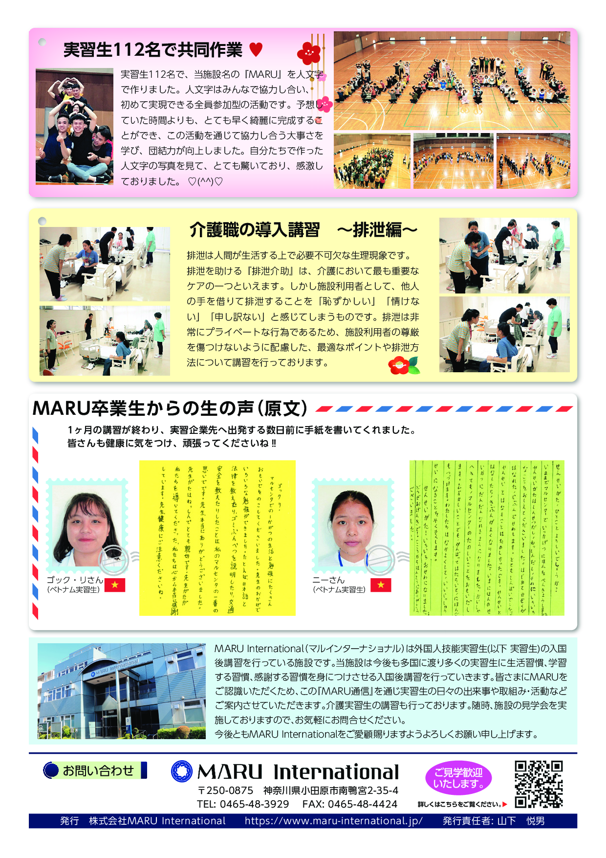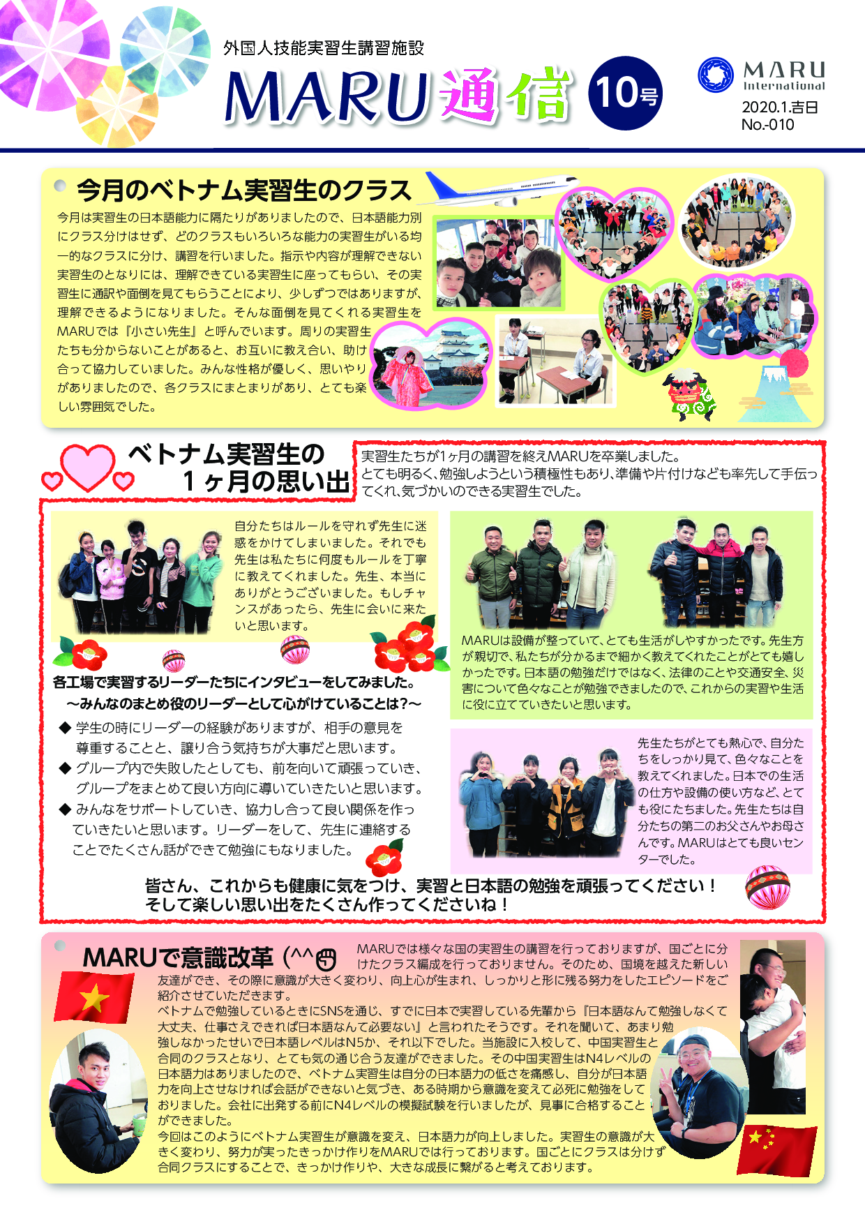 外国人技能実習生の入国後講習の近況を記した『MARU通信11号(2月号)』を発行いたしました。