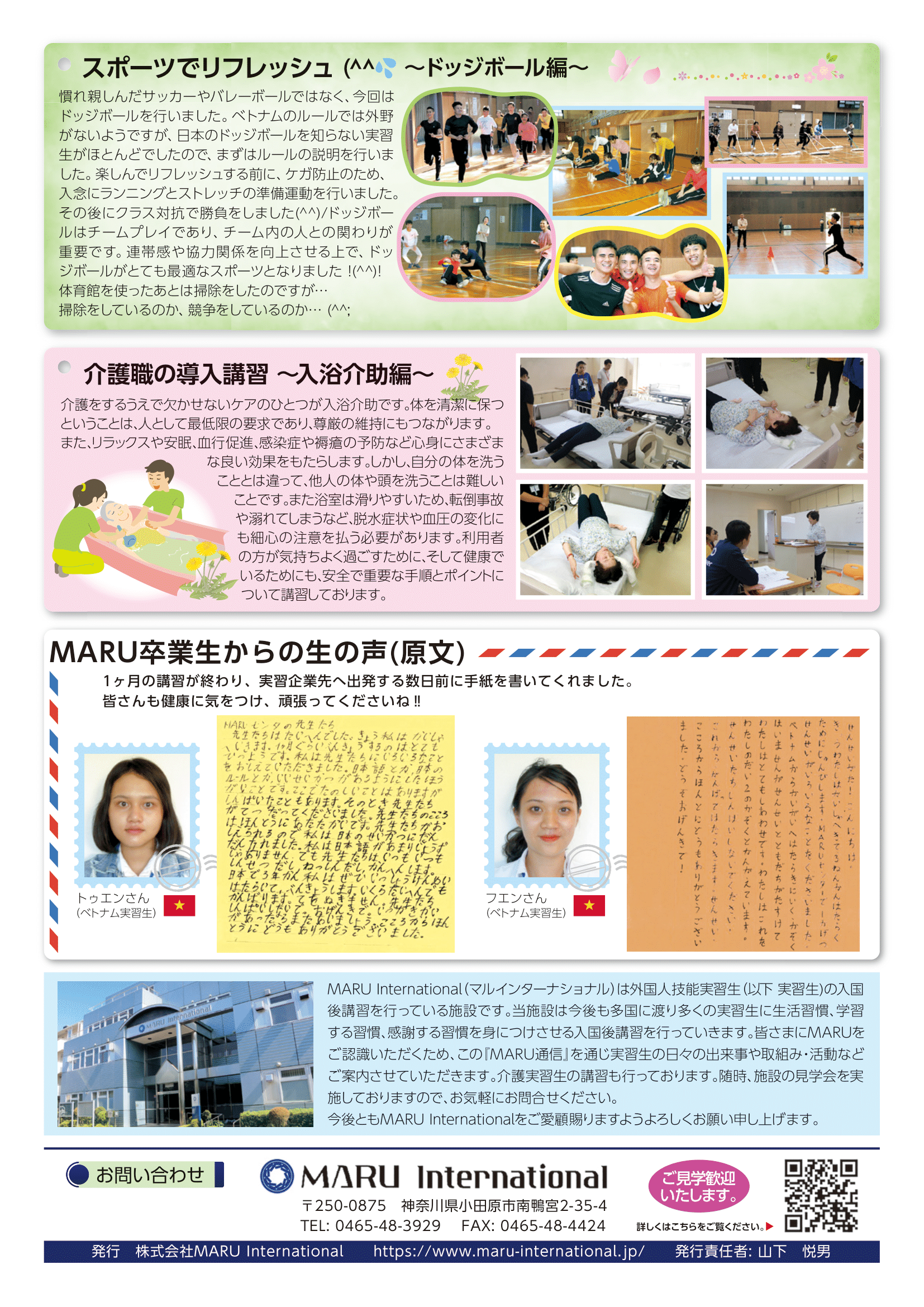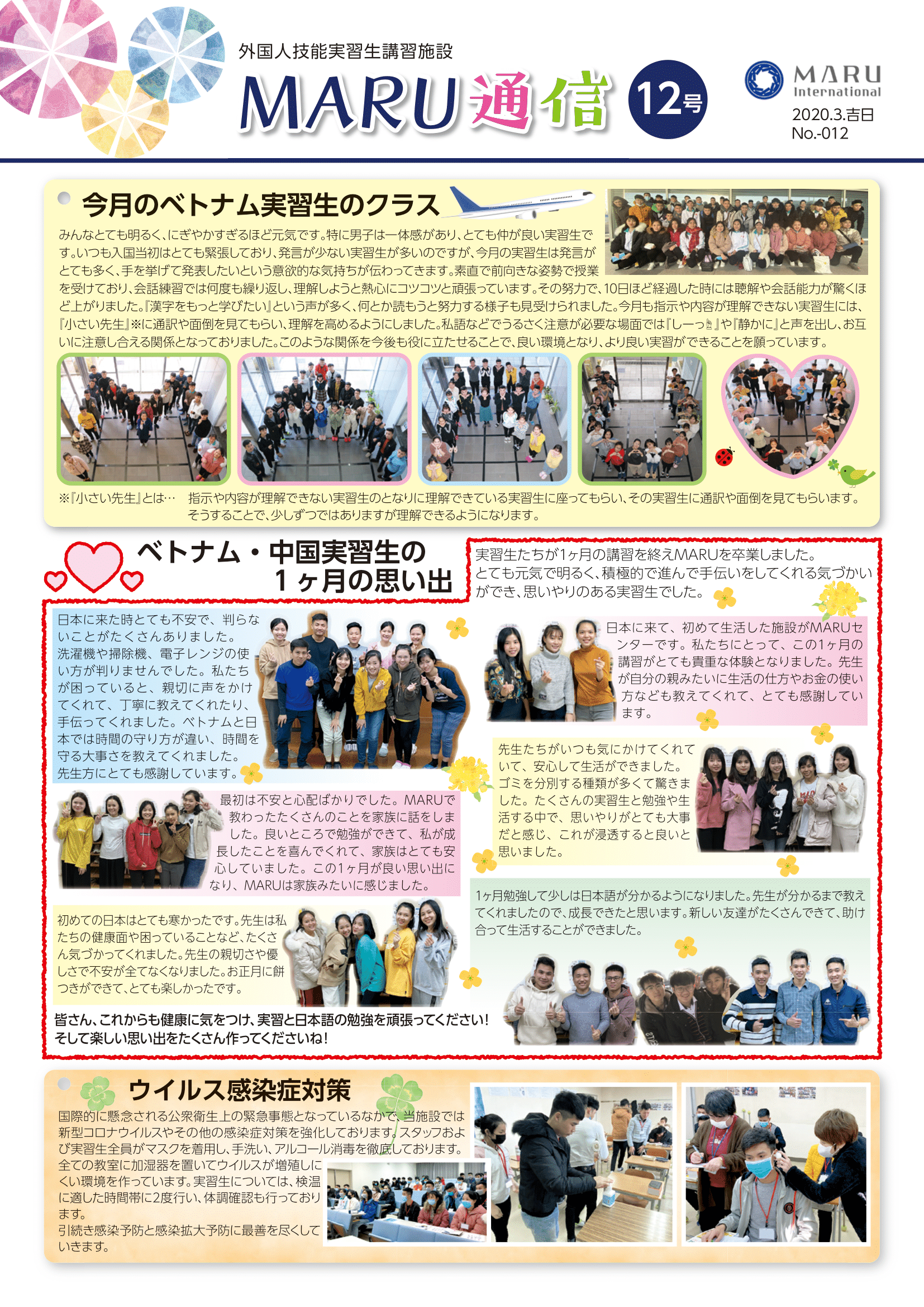 外国人技能実習生の入国後講習の近況を記した『MARU通信12号(3月号)』を発行いたしました。