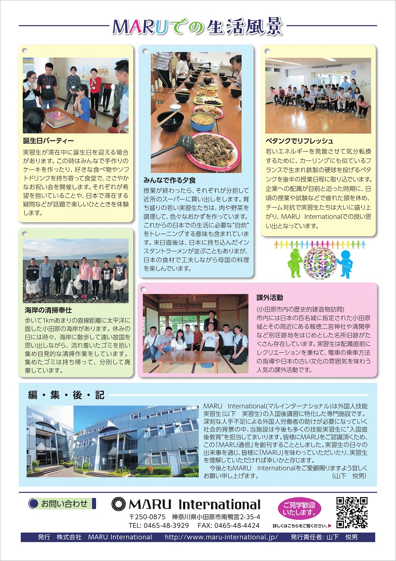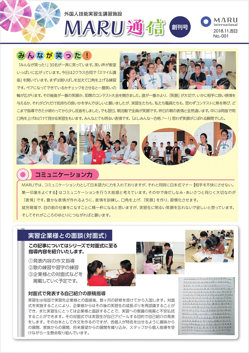 外国人技能実習生の入国後講習に特化した本施設の近況等を記した広報紙『MARU通信創刊号』を発行いたしました。
