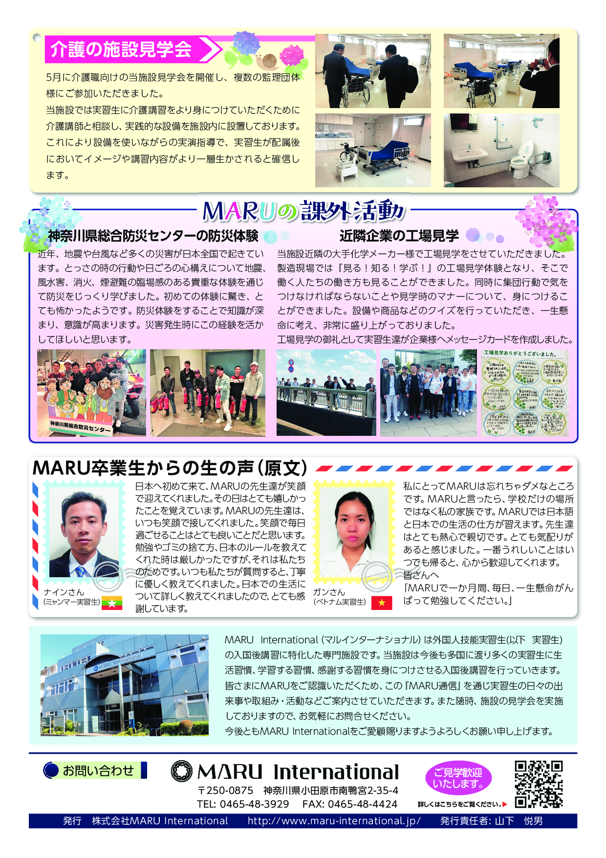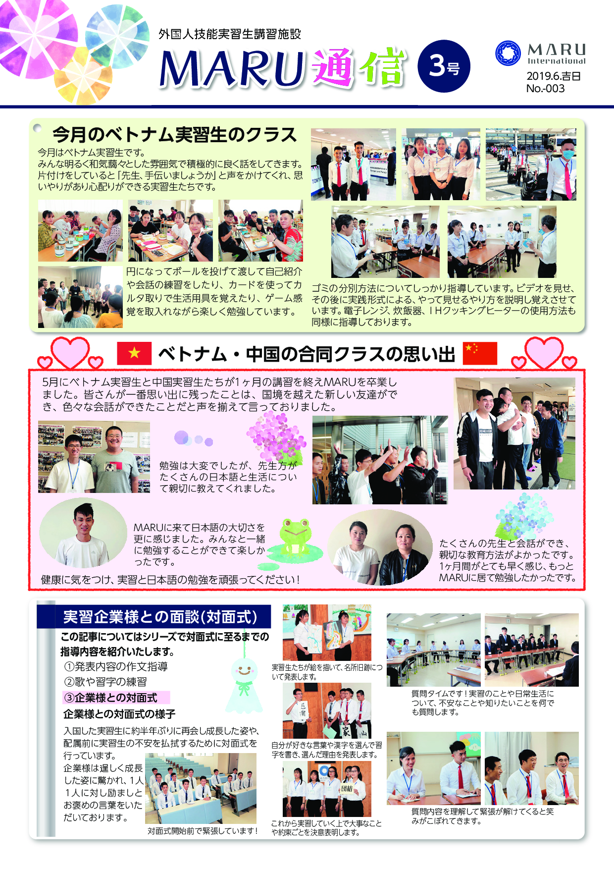 外国人技能実習生の入国後講習の近況等を記した『MARU通信 3号(6月号)』を発行いたしました。